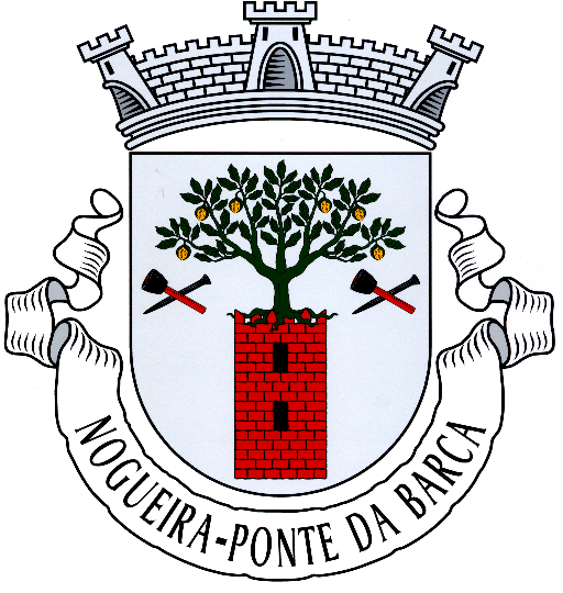 Escudo de prata, uma torre de vermelho lavrada e iluminada de negro, rematada por uma nogueira arrancada de verde e frutada de ouro; a nogueira entre dois pares constituídos por um cinzel de negro e um maço do mesmo, encabado de vermelho e passados em aspa. Coroa mural de prata de três torres. Listel branco, com a legenda a negro: "NOGUEIRA - PONTE DA BARCA".